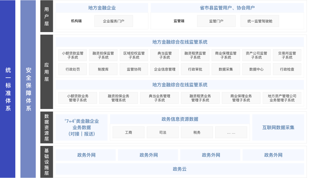 多业态监管中心,支持小贷公司、融资担保、区域性股权市场、典当行、融资租赁商业保理、地方金融资产、投资公司、农民合作社、社会众筹机构、地方交易所等7+4共计11种业态的全面监管